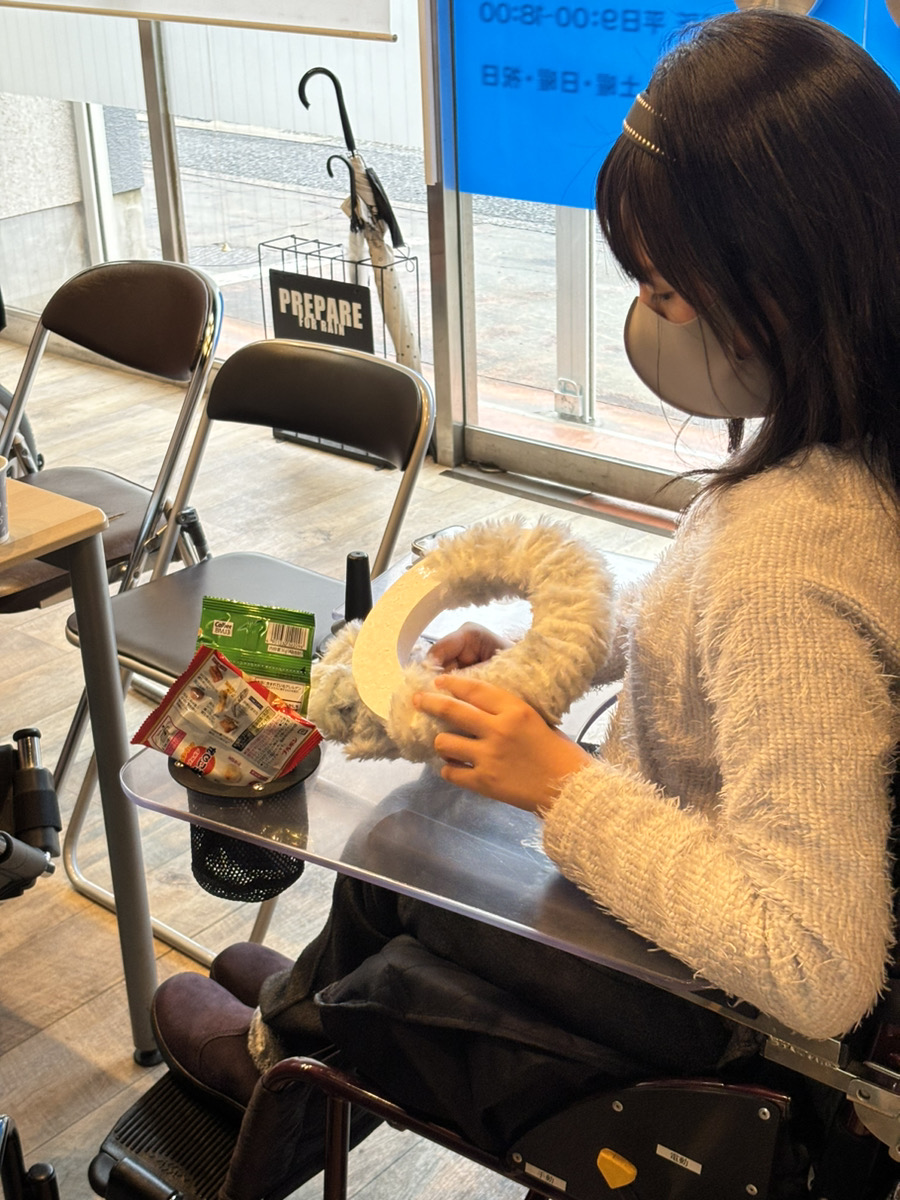 リースはまず、ふわふわの毛糸をリースに巻き付けていきます。